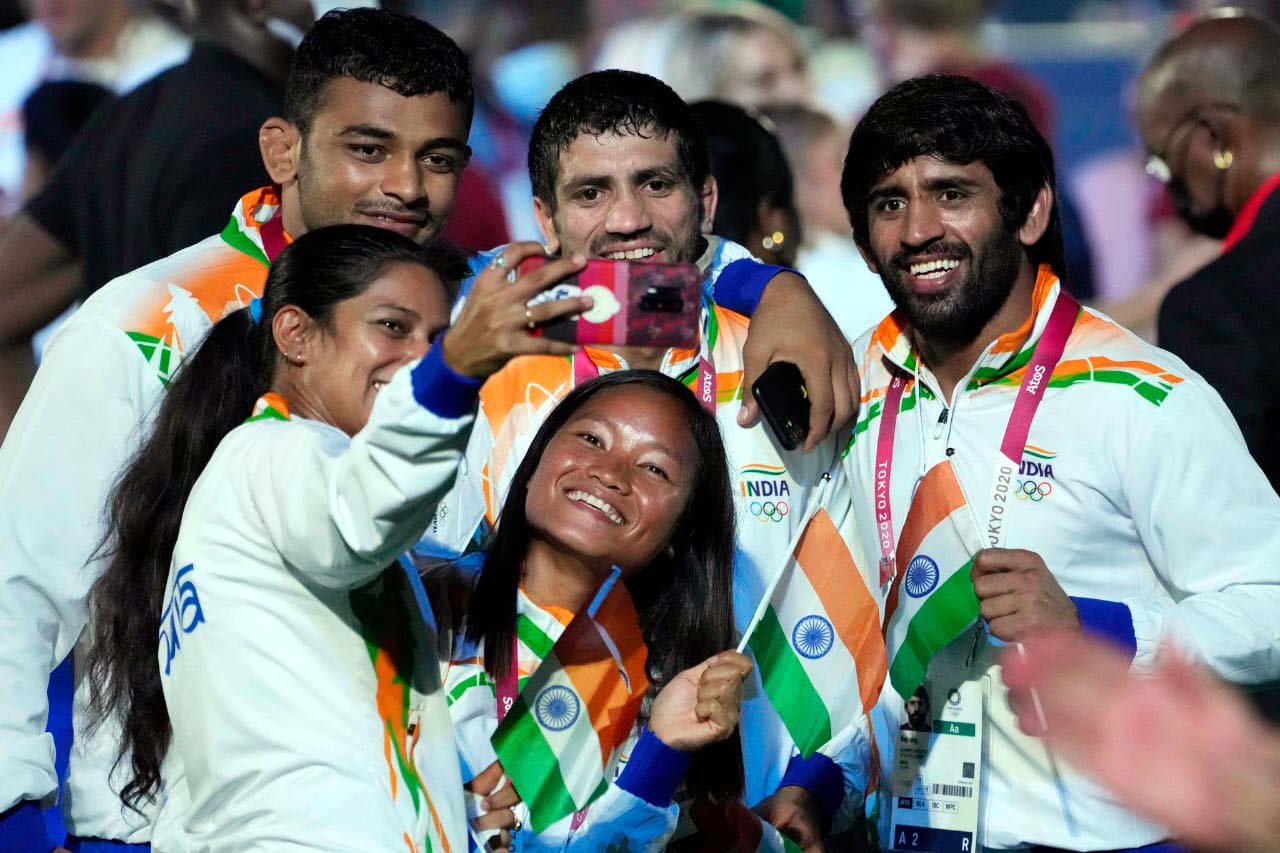 Wrestler Bajrang Punia, who claimed a bronze medal, was flag bearer of India at the ceremony. In contrast to the ethnic outfit athletes wore during the opening ceremony, they were seen in comfortable track suits.