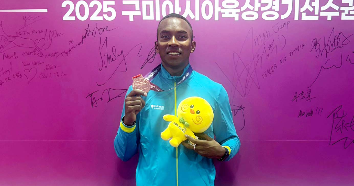 Bronze: Servin Sebasthiyan, men 20km race walk (1:21:13.6), 27 May 2025. Bronze: Shaili Singh, women long jump (6.30 metres), 29 May 2025. Bronze: Yoonus Shah, men 1500m run (3:43.03 seconds), 28 May 2025. Bronze: Animesh Kujur, men 200m run (20.32 seconds, *National Record), 31 May 2025. Bronze: Vithya Ramraj, women 400m hurdles (56.46 seconds), 31 May 2025. Bronze: Pooja, women 800m run (2:01.89 seconds), 31 May 2025. ----------------------------------------------------------------------------- PICS ----------------------------------------------------------------------------- TOP: Srabani Nanda poses with her silver medal at the 26th Asian Athletics Championship in Gumi, South Korea on 31 May 2025. RIGHT: Animesh Kujur displays his bronze medal at the 26th Asian Athletics Championship in Gumi, South Korea on 31 May 2025.