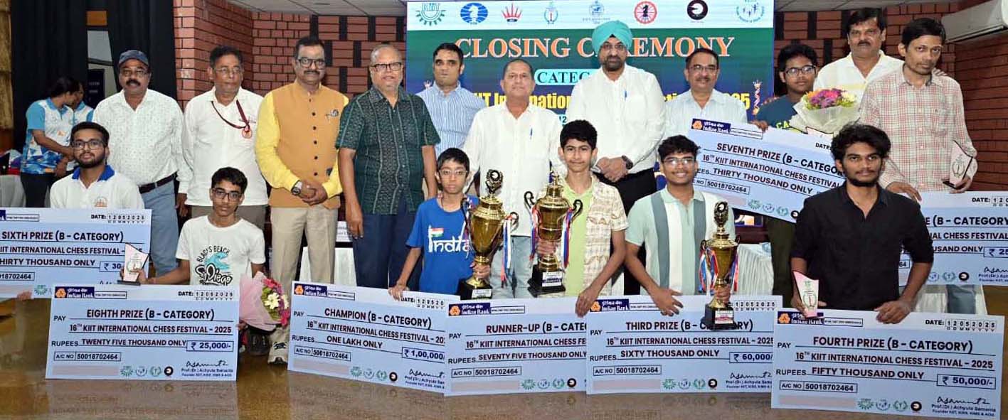 Category-C (Rated 1700 & below): 1. Sahil Ghorghate, Maharashtra (8 pts, prize Rs 1 lakh), 2. Tanmaya Tripathy, Odisha, (7.5 pts, prize Rs 75,000), 3. Amiyanshu Bhowal, West Bengal (7.5 pts, prize Rs 60,000). ---------------------------------------------------------------------------- PICS ---------------------------------------------------------------------------- TOP: Leading prize winners in Categories A and C pose with guests and officials at the 16th KIIT International Chess Festival in Bhubaneswar on 16 May 2025. RIGHT: Leading prize winners in Category B pose with guests and officials at the 16th KIIT International Chess Festival in Bhubaneswar on 12 May 2025.