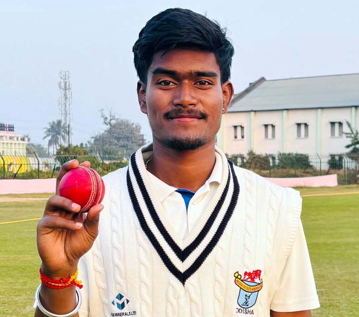 RIGHT: Odisha bowler Asutosh Marndi jubilates after bagging five wickets in their C K Nayudu Trophy match against Haryana in Sambalpur on 23 January 2026.