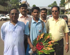 Officials of Orissa Volleyball Association, including secretary Kamala Kanta Pandey, joint-secretary Somanath Mohapatra and National Referee Board convener Rabi Narayan Routray garlanded Murudi at the railway station in Bhubaneswar this morning.