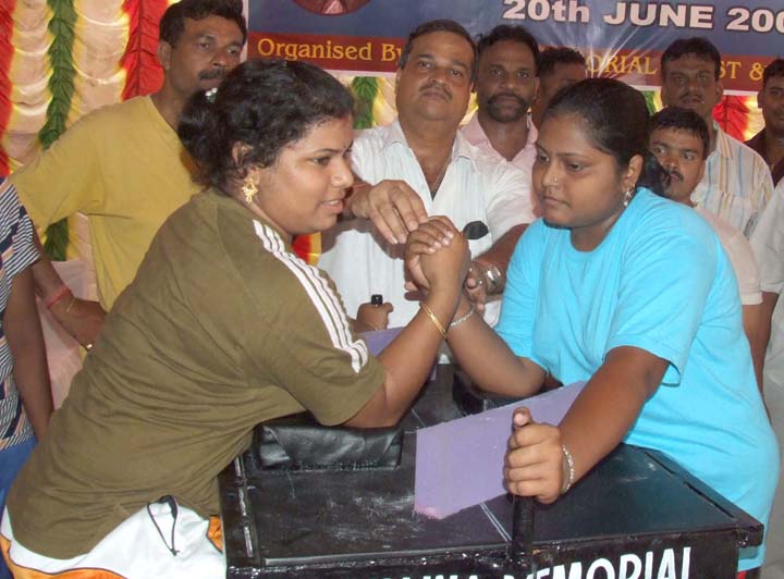 Caption: Competitors fight for victory in the Bhaina Memorial All-Orissa Armwrestling Championship in Bhubaneswar today.