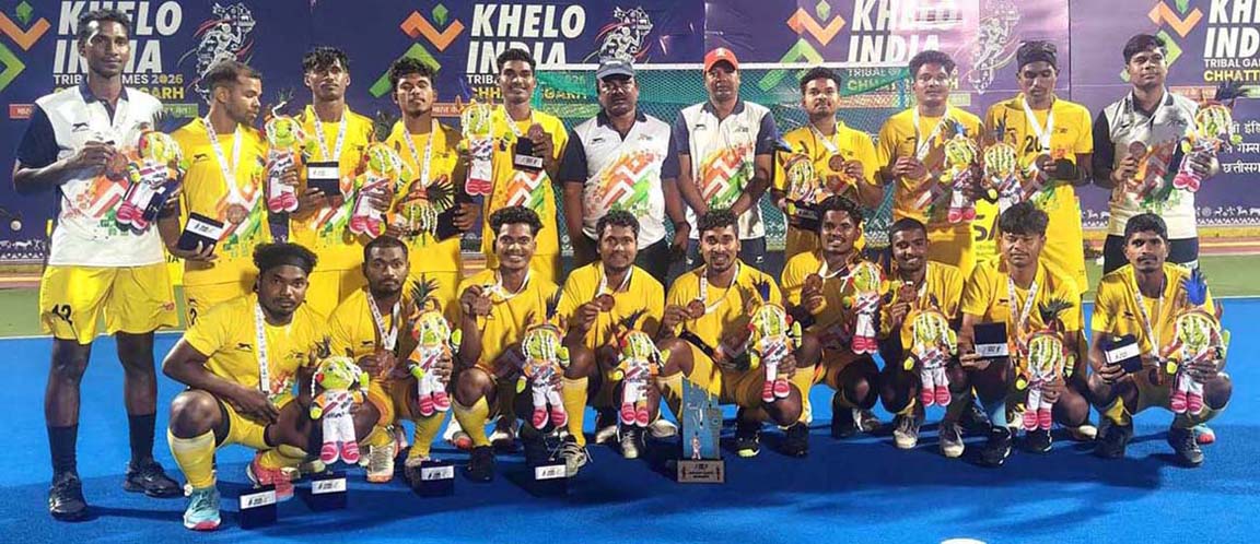RIGHT: Members of Odisha men hockey team pose with their gold medal and trophy at the 1st Khelo India Tribal Games in Raipur on 1 April 2026.