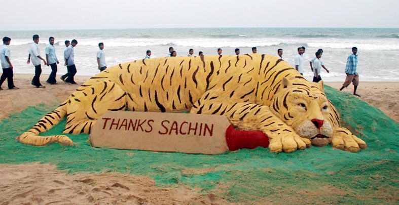 A day after Sachin Tendulkar dedicated his 42nd Test century for the cause of tiger conservation project in India, internationally acclaimed sand artist Sudarsan Pattnaik created 15-foot-long tiger...