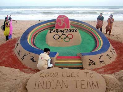 Renowned sand art world champion Sudarsan Pattnaik wished good luck to Indian contingent for the Beijing Olympic Games in his own inimitable way by sculpting a sandy Olympic stadium at the Puri beach... Read